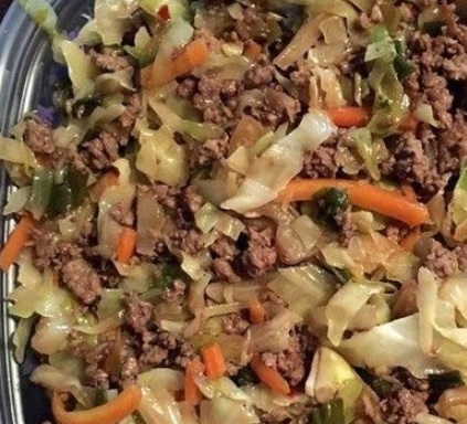 In a separate pan, I put sesame oil, soy sauce, chopped green onion and chopped garlic together and sautéed until tender. I then add cabbage , crush red pepper & ground ginger & cook until almost tender, it still had a slight crunch which I prefer to super soft cabbage. Once that was done I drained the excess fat from the burger and added it to the pan with the rest of the ingredients and stirred. I added a little more soy sauce for taste but not much. Turned out awesome. Husband and son loved it. Low carb, moderate fat and moderate protein, perfect !